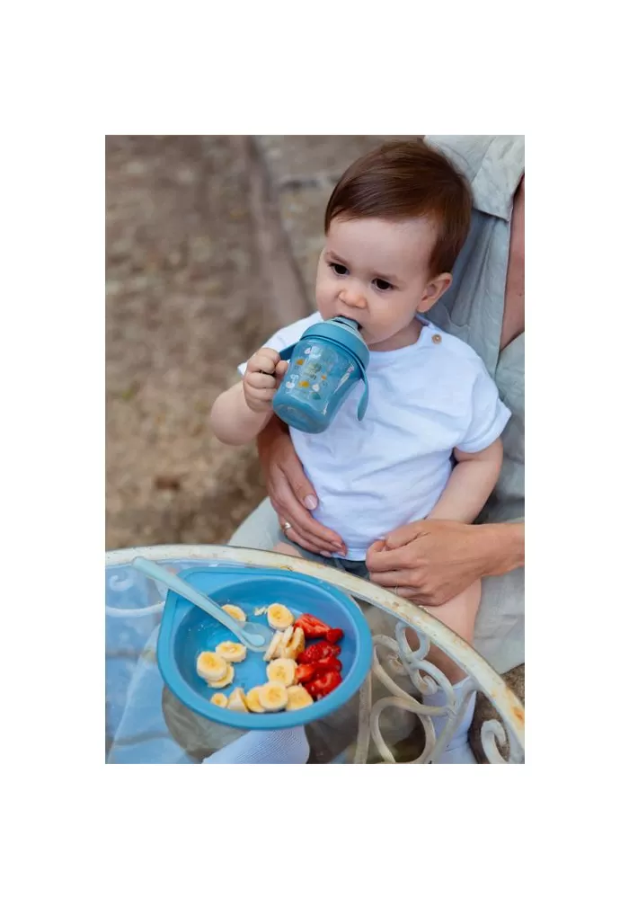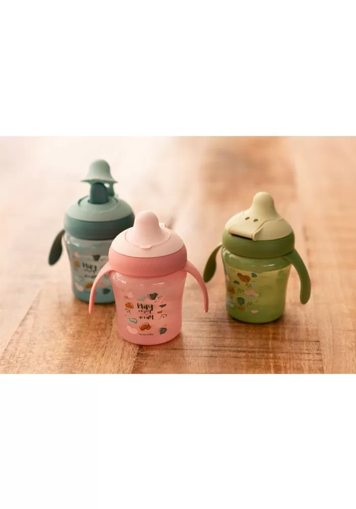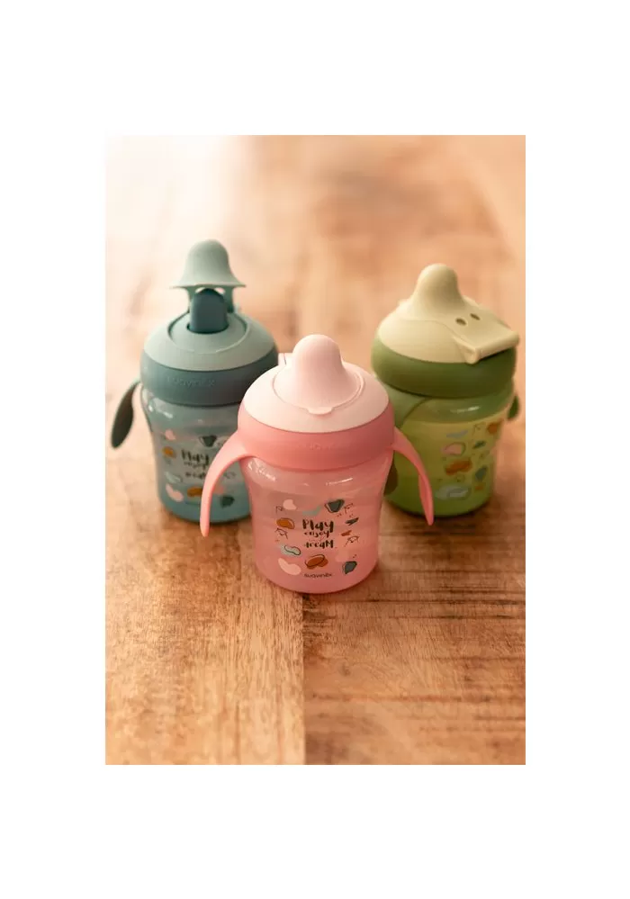 Hrníček s oušky a speciální savičkou má ergonomický tvar a ouška pro dobrý úchop. Ouška jsou odnímatelná pro přirozený přechod na běžný hrníček či sklenici. Speciální savička zabraňuje odkapávání tekutiny a skvrnám. Je chráněna výklopným hygienickým víčkem. Tvrdost přizpůsobena proti prokousnutí, zároveň příjemná a bezpečná pro drobná dětská ústa.